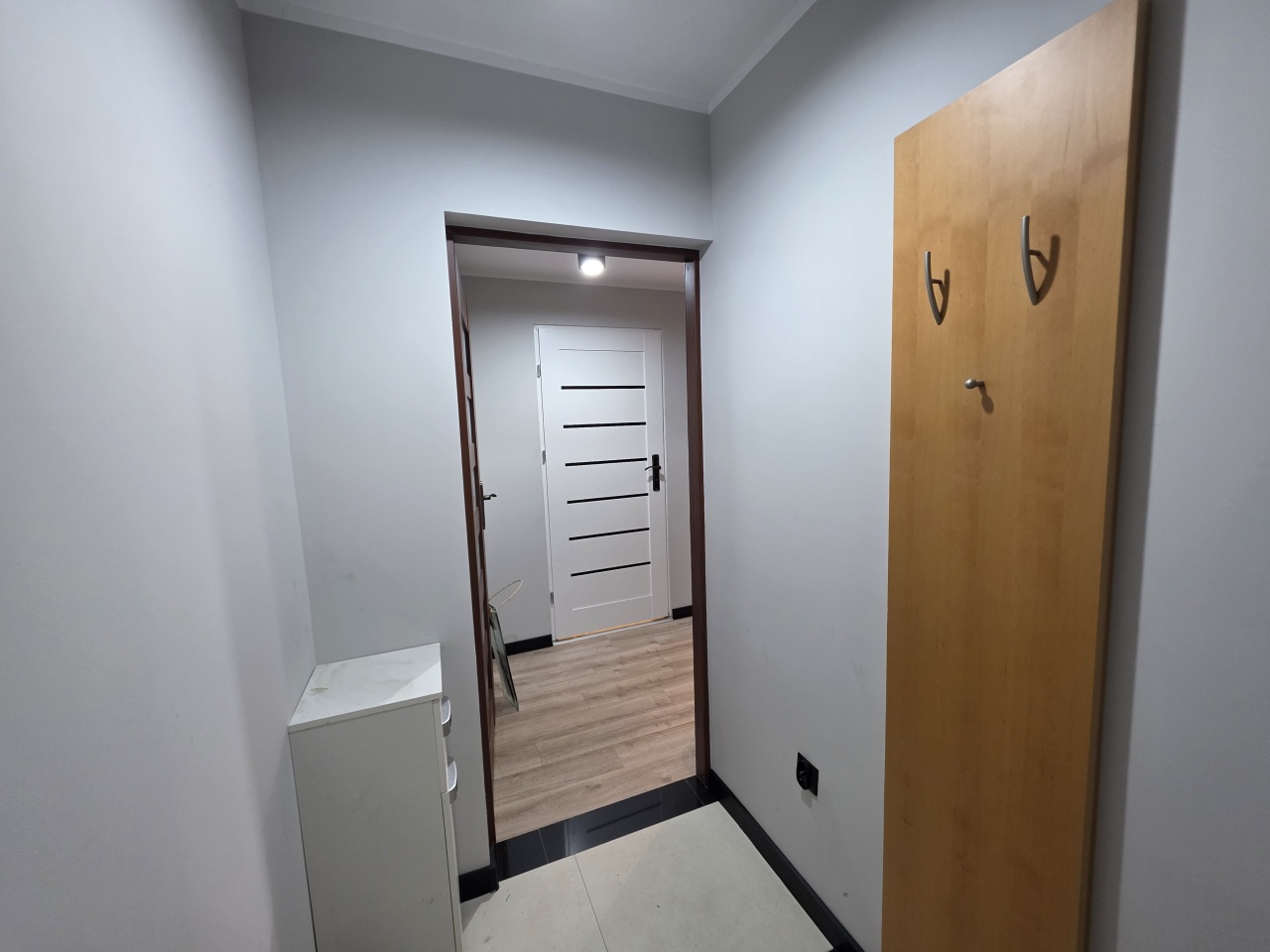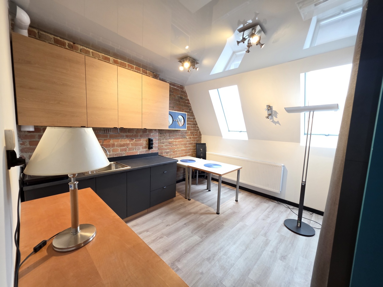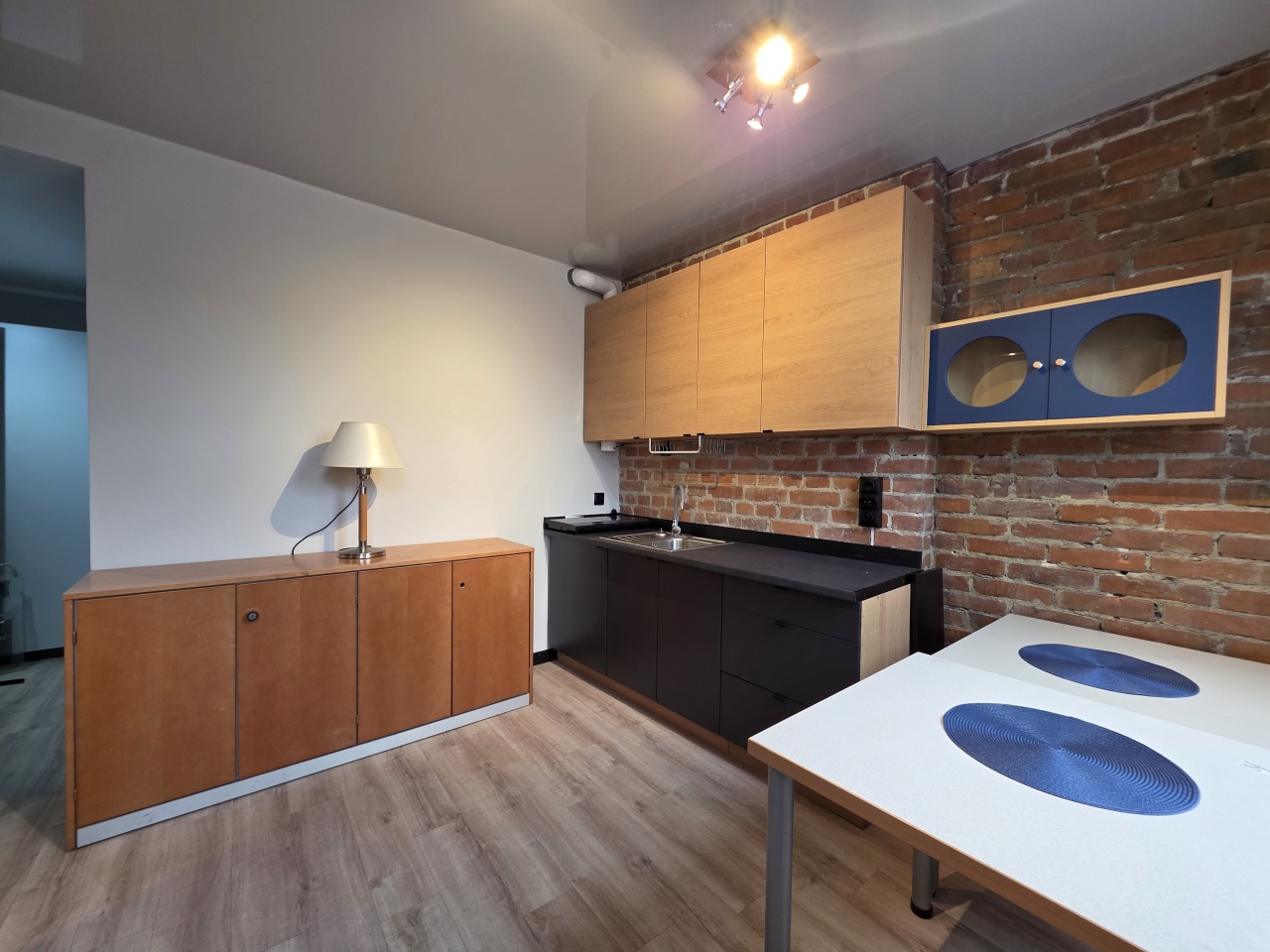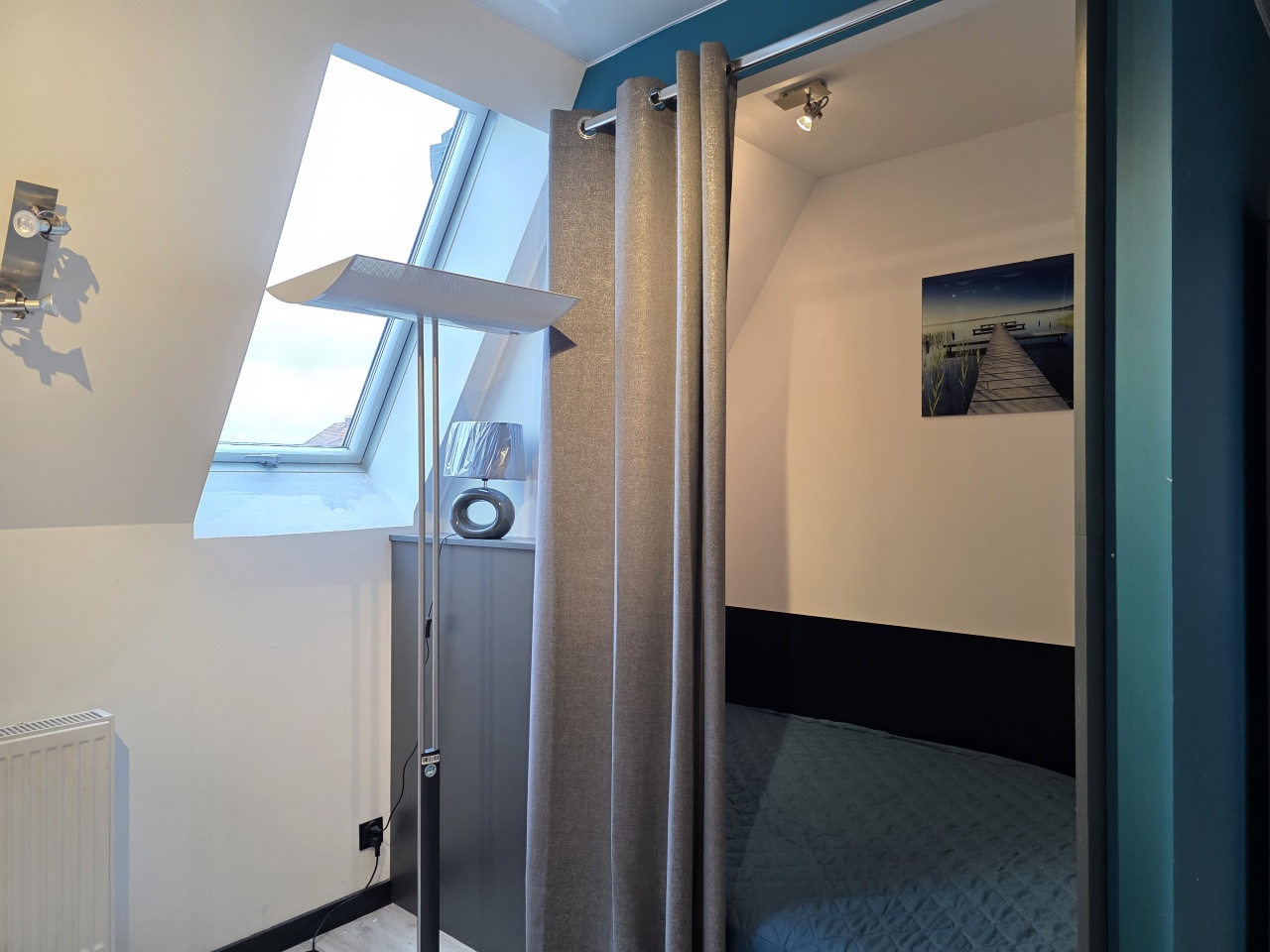 Mieszkanie typu studio, o pow. 30 m2, wyposażone i umeblowane, składa się przedpokoju i otwartego salonu z aneksem kuchennym i wydzielonym miejscem na łóżko sypialniane.